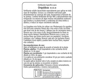 Fertilizante soluble formulado especialmente para la nutrición y el desarrollo controlado de Orquídeas ya sean epífitas, terrestres, o semiterrestres.