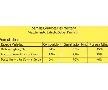 Germinación mínima: Ballica Inglesa Nui 85%, Festuca Arundinacea Fawn 85%, Pasto Bermuda Spring Green 70%
