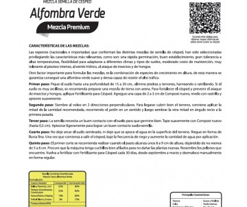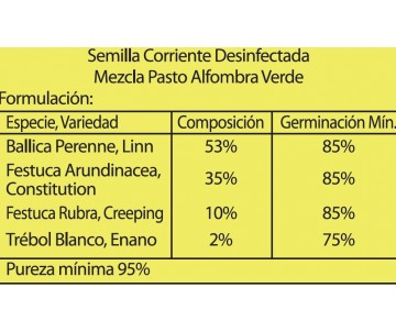 Composición mezcla: Lolium Perenne Linn 53%, Festuca Arundinacea Constitution 35%, Festuca Rubra Creeping10%, Trébol Enano 2%.