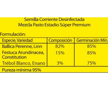 Composición mezcla: Ballica Perenne Linn 82%, Festuca arundinacea Constitution 15%, Trébol Blanco, Enano 3%.