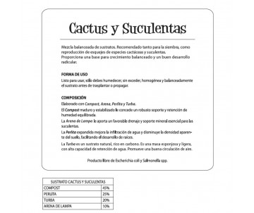 Este sustrato está diseñado específicamente para suculentas y cactus, garantizando un drenaje adecuado y una aireación óptima, lo que es esencial para evitar el exceso de humedad que puede dañar las raíces.